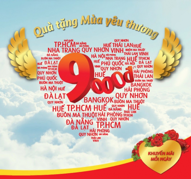 Quà tặng mùa yêu thương. Tưng bừng khuyến mãi giá chỉ từ 9.000đ Vietjet Air tưng bừng khuyến mãi mỗi ngày với giá vé bất ngờ chỉ với 9.000 đồng.