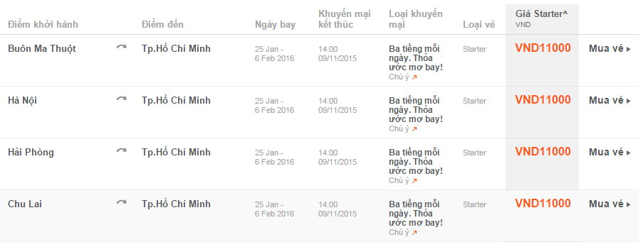 Trong ngày đầu tiên triển khai khuyến mãi “Ba tiếng mỗi ngày – Thoả ước mơ bay!”  (27/05/2015), hãng ưu đãi vé máy bay 11.000 VNĐ cho các chặng: Buôn Ma Thuột<=> Hồ Chí Minh, Hà Nội <=> Hồ Chí Minh,Hải Phòng <=> Hồ Chí Minh và nhiều chặng bay khác.