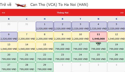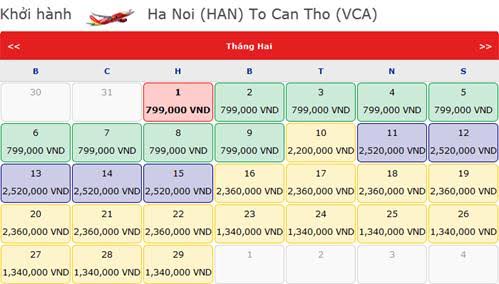 - Thời gian bay:Từ ngày 01/02/2016 – 07/02/2016 chặng VCA - HAN
