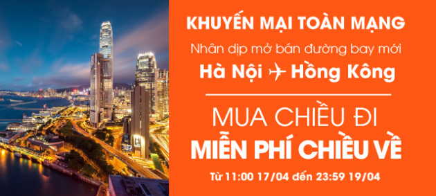 Nhân dịp khai trương mở bán đường bay Hà Nội - Hồng Kông và ngược lại, Jetstar Pacific hân hạnh giới thiệu chương trình khuyến mại “Mua chiều đi, miễn phí chiều về” Chương trình bắt đầu lúc 11:00 Thứ 6, ngày 17/4 đến 23:59 Chủ nhật, ngày 19/04. Hãy nhanh tay mua ngay vé rẻ trước khi vé được bán hết. Kênh bán: Tất cả các kênh · Vebay247.vn, · Trung tâm phục vụ khách hàng 08 2216 3883 · Các phòng vé và đại lý bán vé máy bay trên toàn quốc |