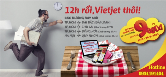 Chào mừng đường bay mới TP.HCM – Chu Lai (Quảng Nam), Vietjet khuyến mãi hàng ngàn cơ hội bay giá chỉ từ 9,000 đồng trong nguyên tuần từ 19/3 đến 26/3 vào 12 – 14h mỗi ngày. Chương trình còn áp dụng cho các chặng bay từ TP.HCM đến Đài Bắc, Đồng Hới và chặng bay Hà Nội – Quy Nhơn.