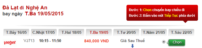 Giá vé máy bay từ Vinh đi Đà Lạt là 840.000đ (Chưa bao gồm thuế và phí), chỉ duy nhất hãng VietJet Air đang khai thác.