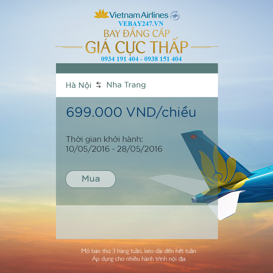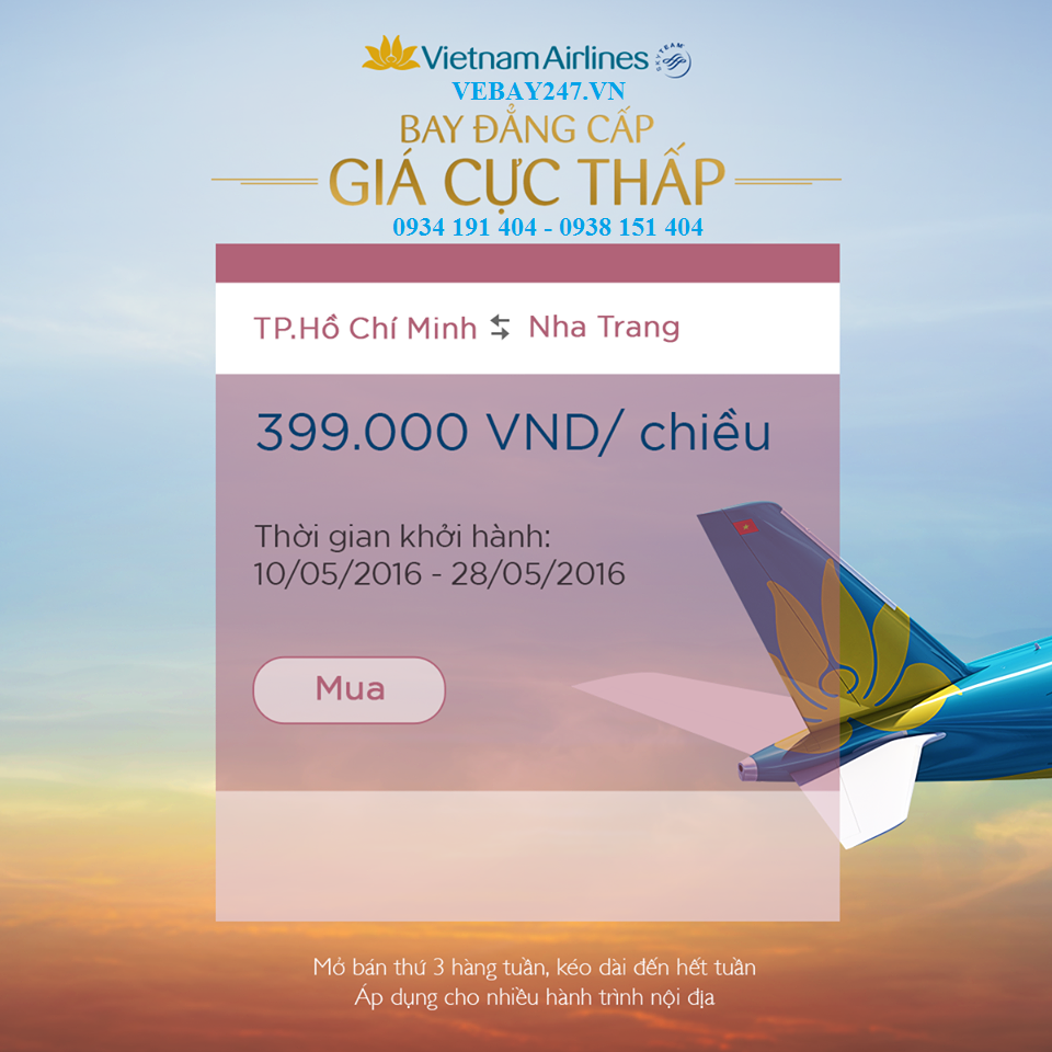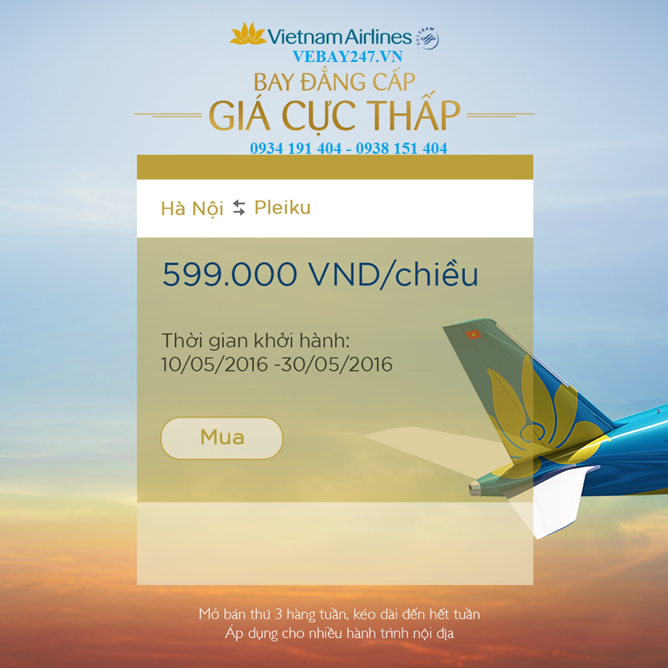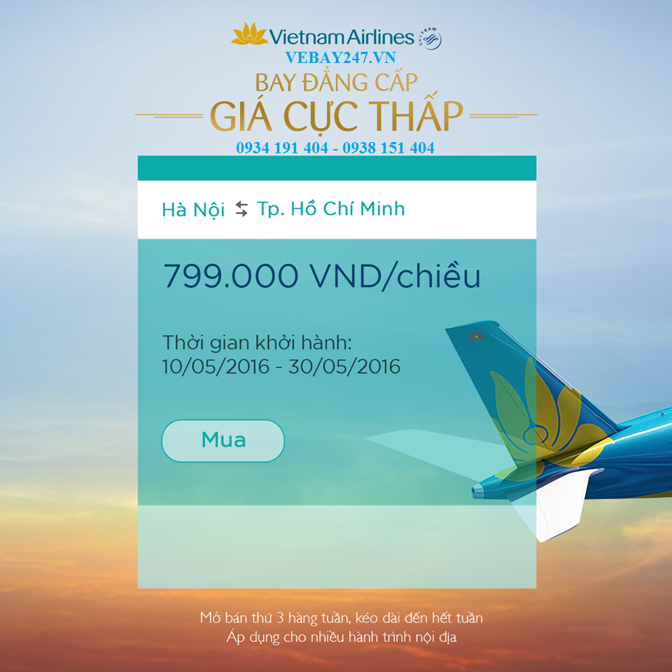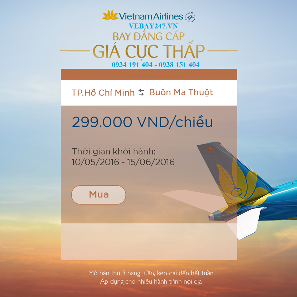 Đồng hành cùng chương trình "BAY ĐẲNG CẤP, GIÁ CỰC THẤP", của Vietnam Airlines trong tuần này, các bạn sẽ có cơ hội đặt được những tấm vé máy bay nội địa với giá chỉ 299.000đ/chiều. Vé giá rẻ chỉ được mở bán vào thứ 3 hằng tuần!, vì vậy các bạn hãy nhanh tay lên nhé
