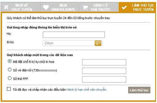 Bước 2: Bạn nhập các thông tin Họ, Đi từ sân bay nào và một trong ba dữ liệu Mã đặt chỗ, Số vé điện tử, Số thẻ FFP. Cuối cùng nhấn nút Làm thủ tục.