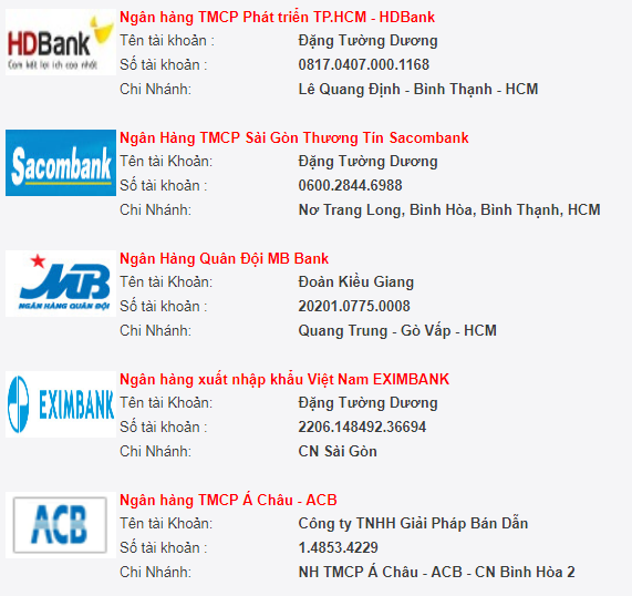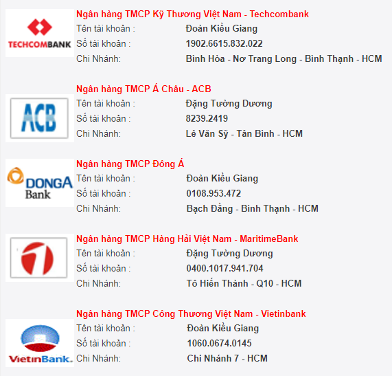 Quý khách có thể thanh toán bằng cách chuyển tiền tới tài khoản của chúng tôi, hãy chọn tài khoản ngân hàng mà quý khách có thể chuyển một cách tiện lợi nhất.