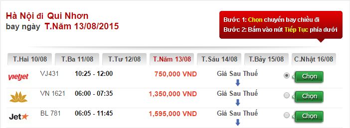 Vé máy bay Hà Nội đi Quy Nhơn của hãng hàng không Vietjet Air. Chặng bay này mất khoảng 1h35 phút. Giá vé tầm 750.000 VND(Chưa thuế phí).